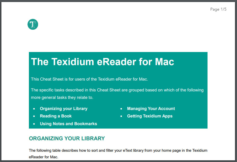 This Cheat Sheet is for users of the Texidium eReader for Mac. See the bottom of the page for a downloadable reference document of the features of the Texidium Mac app.
