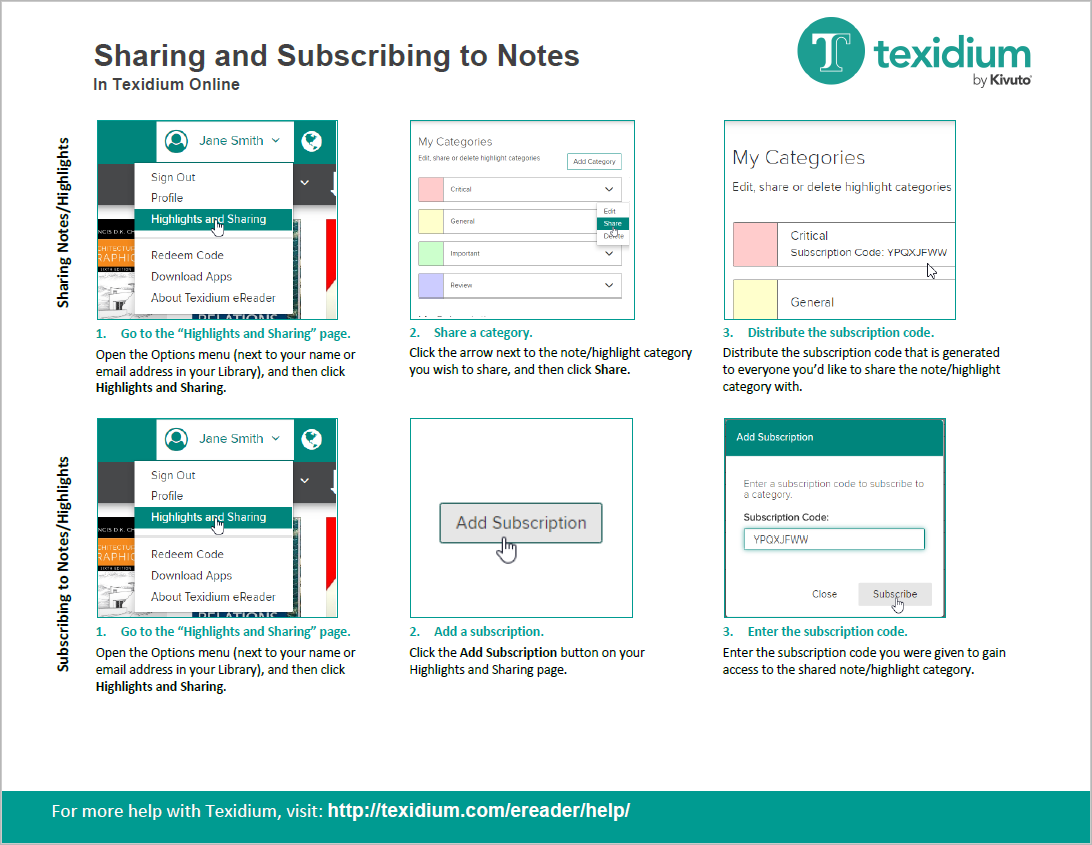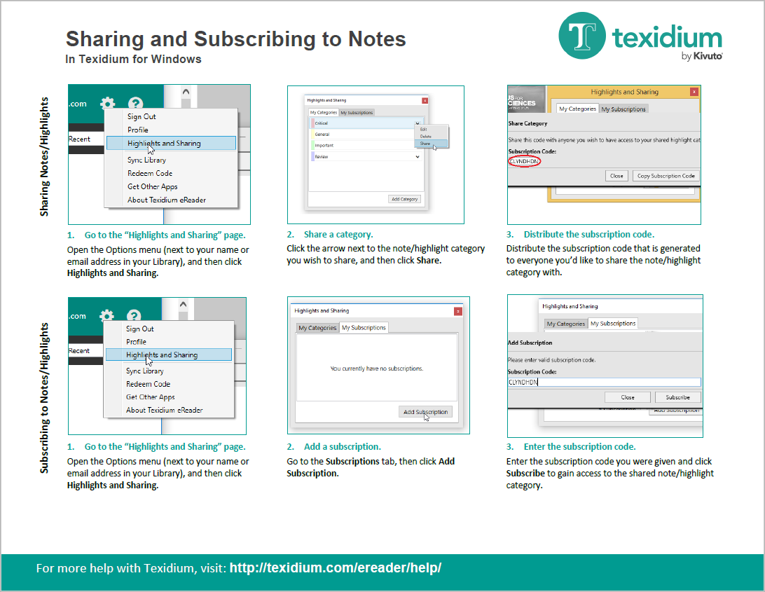 The tip sheets below describe how to share notes and highlights and subscribe to notes/highlights shared by others.
